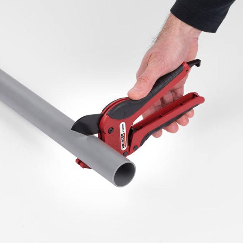Este cortatubos corta sin esfuerzo tubos de aluminio, cobre y PVC con un diámetro máximo de 42 mm.