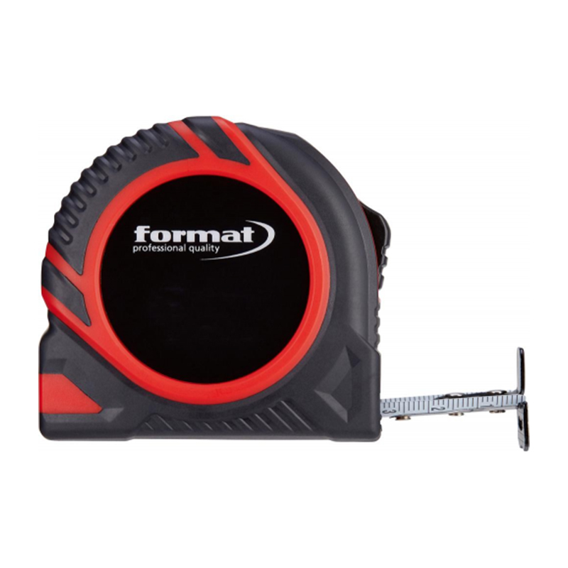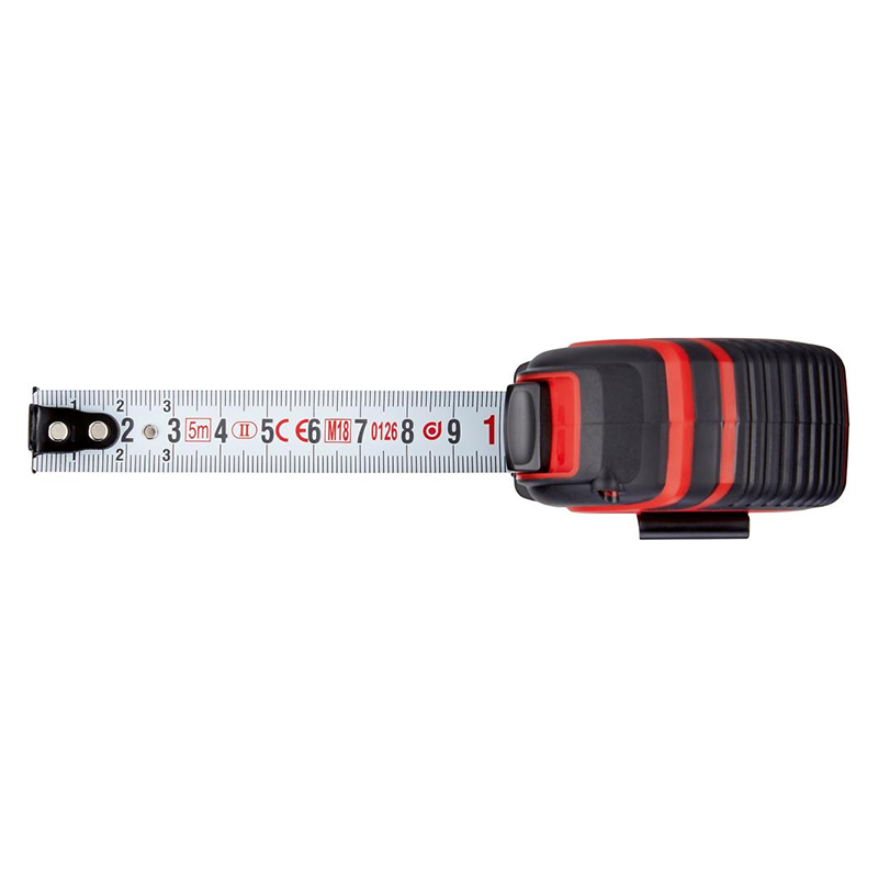 Flexómetro en carcasa de plástico y goma resistente a los golpes. Retroceso de cinta con tecla de parada.
