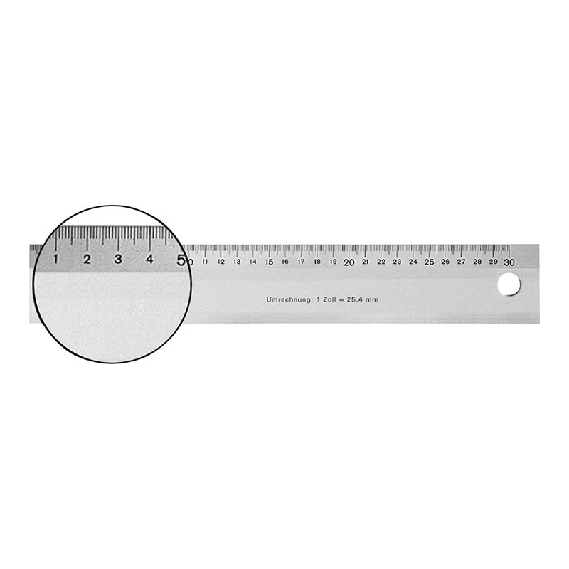 Regla de aluminio anodizado, legible sin reflejos, con escala en milímetros en negro y borde biselado.