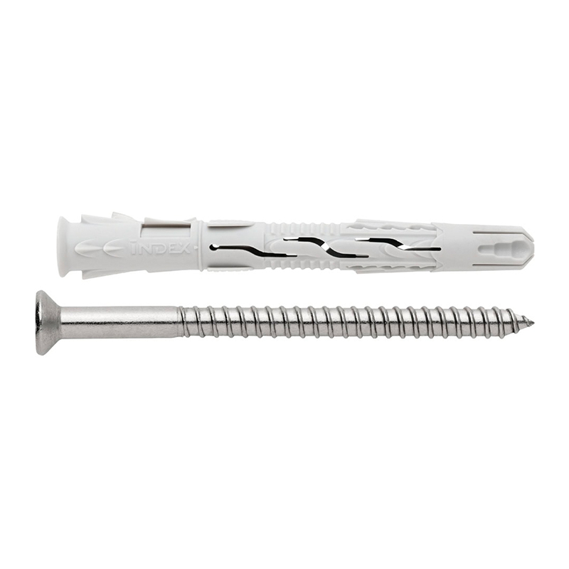 Taco de nylon de alto rendimiento, con tornillo de cabeza avellanada y huella TX. Se puede emplear para fijar elementos de cargas medias sobre materiales huecos y macizos.